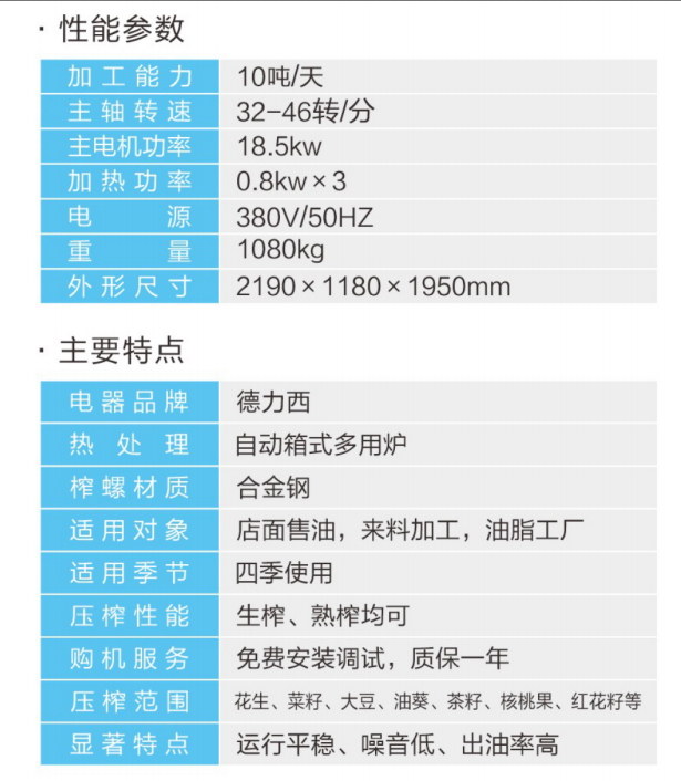 ★壓榨范圍:花生、大豆、菜籽、油葵、茶籽、芝麻等;★適用對(duì)象:店面油坊和微小油坊;★壓榨性能:熱榨一次榨盡,免費(fèi)安裝調(diào)試